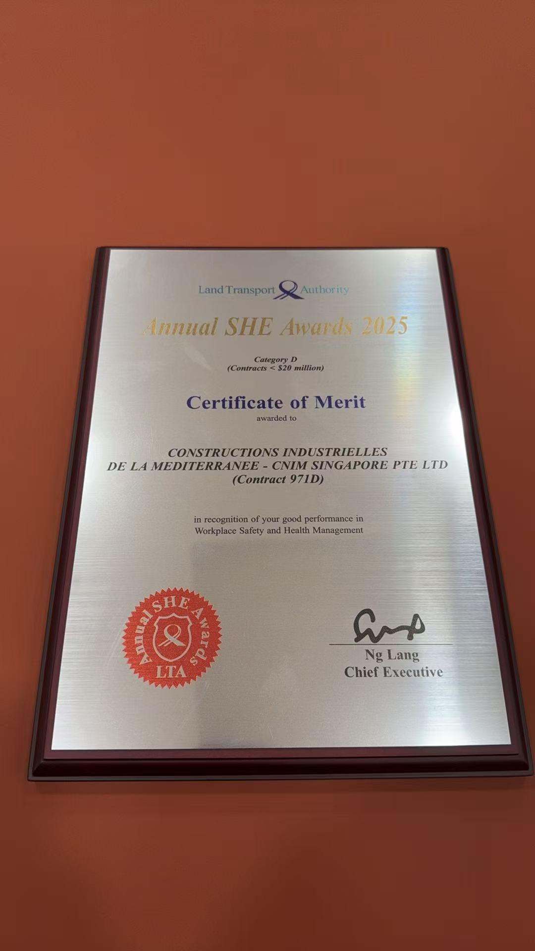 We are proud to share that Constructions Industrielles de la Méditerranée – CNIM Singapore Pte Ltd has been awarded the Certificate of Merit in Category D (Contracts <$20 million) at the Land Transport Authority (LTA)’s Annual Safety, Health and Environment (SHE) Awards 2025 for our outstanding performance in Contract 971D.